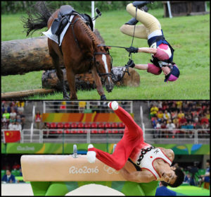 The idiom “Get back on the horse” is as much about facing and overcoming your problems as it is about “keep trying until you get it right”. This was especially applicable to men’s gymnastic training since you make mistakes and fall more frequently than not when you start to try a new trick. Also there is an apparatus called the sidehorse or just horse for short. Injuries from falling off the horse were rarely serious because this apparatus is lower to the ground than the high-bar, parallel bars, or rings. The frequency, the number and the awkwardness of the falls were comparatively very high. There’s something about the balance and movement being abnormally circular with so much weight shifting and hand movements that makes staying on the horse so difficult. We talked about this event more like an animated object than any other event. “I got thrown again.” “The horse was just a little wild today.” “It doesn’t do any good to sooth it by talking nicely to it.” Or excuses like “it kicked me” or “I swear it lifted its head and bit my leg”. Side horse is the only gymnastic apparatus referred to as “The Beast”. Most all-around gymnasts worried the most about the possibility of hitting a snag and taking a fall from the horse.